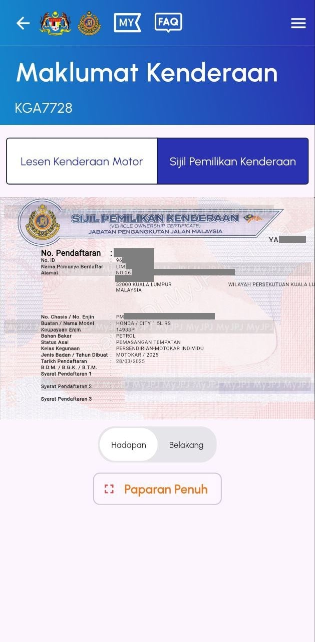 - The owner’s details, such as their I.C. number, full name, and registered address