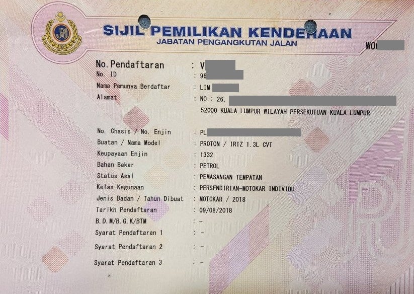 In Malaysia, the vehicle grant typically features details of the vehicle and its ownership, such as: