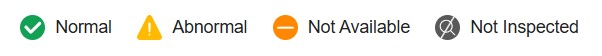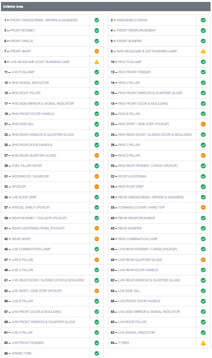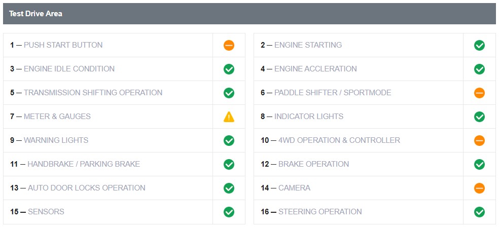 On the inspection report, the car components and their status will be shown clearly. A check mark in a green circle means the component performs normally, while an exclamation mark in a yellow triangle indicates abnormal behaviour.